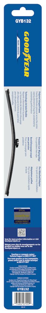 Goodyear Rear wiper blades are designed to provide enhanced rear window visibility. Goodyear offers a complete line of universal rear blades to fit integral, beam and conventional wiper arms, so you can replace with the same style blade that came off your vehicle. Installation is quick and easy with simple to follow instructions inside the package. To see all around you, don’t forget to replace your rear wiper with Goodyear Rear wiper blades. Blades are available in 10” to 16” lengths.
